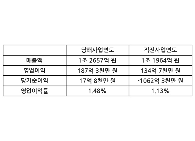 이번사업연도의 매출액은 직전사업연도 대비 5.79% 증가한 1조 2657억 원, 영업이익은 187억 3천만 원, 당기순이익은 17억 8천만 원이라고 공시했다.