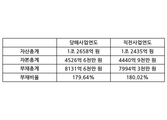 또한, 이번사업연도의 자산총계는 1조 2658억 원으로 직전사업연도 대비 1.79% 증가한 한편, 부채총계는 8131억 6천만 원으로 1.72% 증가, 자본총계는 4526억 6천만 원으로 1.93% 증가했다.