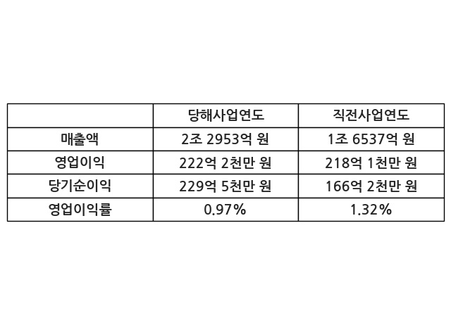이번사업연도의 매출액은 직전사업연도 대비 38.8% 증가한 2조 2953억 원, 영업이익은 222억 2천만 원, 당기순이익은 229억 5천만 원이라고 공시했다.