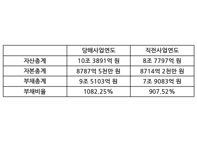 또한, 이번사업연도의 자산총계는 10조 3891억 원으로 직전사업연도 대비 18.33% 증가한 한편, 부채총계는 9조 5103억 원으로 20.26% 증가, 자본총계는 8787억 5천만 원으로 0.84% 증가했다.