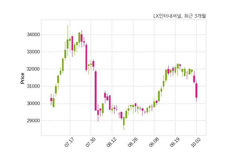 한편, LX인터내셔널은 장 마감 이후 해당 기업공시를 발표했으며 오늘 종가가 30,350원, 거래량은 228,089주로, 직전 거래일 대비 900원(-2.88%) 하락했다.