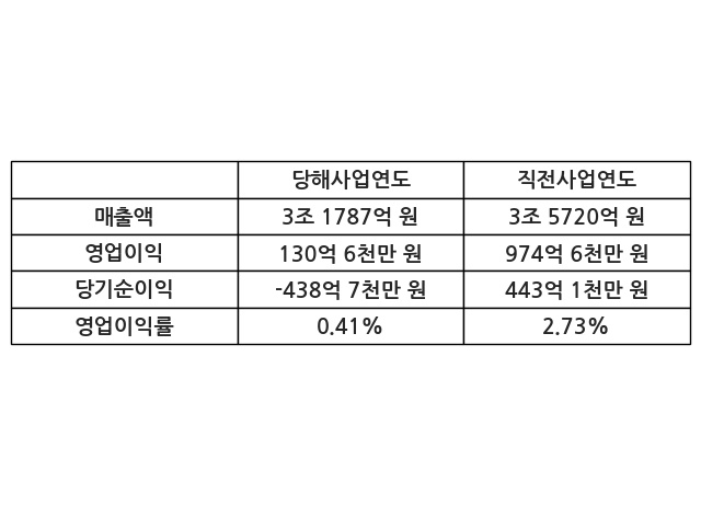 이번사업연도의 매출액은 직전사업연도 대비 -11.01% 감소한 3조 1787억 원, 영업이익은 130억 6천만 원, 당기순이익은 -438억 7천만 원이라고 공시했다.
