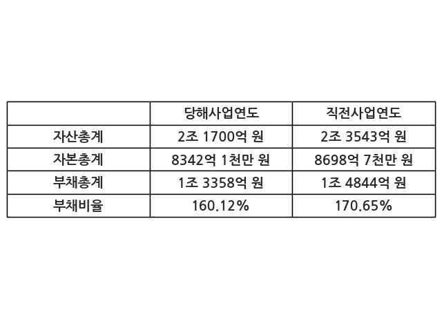 또한, 이번사업연도의 자산총계는 2조 1700억 원으로 직전사업연도 대비 -7.83% 감소한 한편, 부채총계는 1조 3358억 원으로 -10.01% 감소, 자본총계는 8342억 1천만 원으로 -4.1% 감소했다.