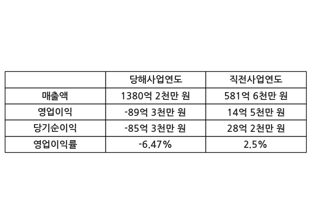 이번사업연도의 매출액은 직전사업연도 대비 137.3% 증가한 1380억 2천만 원, 영업이익은 -89억 3천만 원, 당기순이익은 -85억 3천만 원이라고 공시했다.