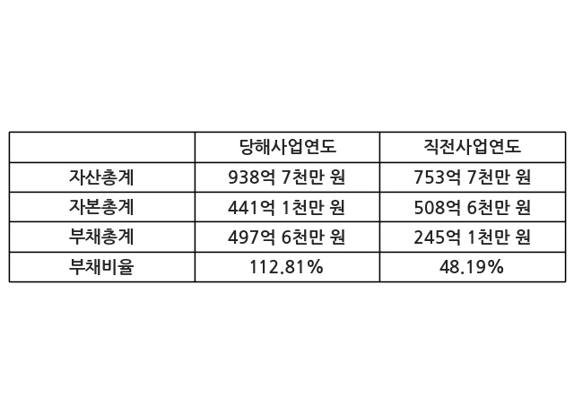 또한, 이번사업연도의 자산총계는 938억 7천만 원으로 직전사업연도 대비 24.54% 증가한 한편, 부채총계는 497억 6천만 원으로 103.0% 증가, 자본총계는 441억 1천만 원으로 -13.28% 감소했다.