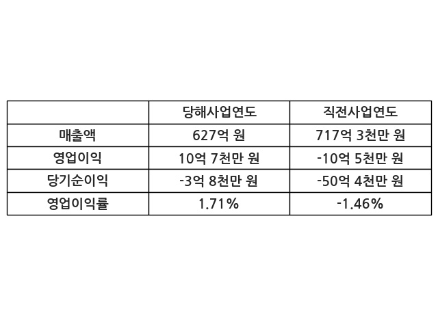 이번사업연도의 매출액은 직전사업연도 대비 -12.59% 감소한 627억 원, 영업이익은 10억 7천만 원, 당기순이익은 -3억 8천만 원이라고 공시했다.