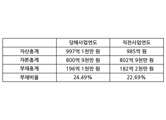 또한, 이번사업연도의 자산총계는 997억 1천만 원으로 직전사업연도 대비 1.22% 증가한 한편, 부채총계는 196억 1천만 원으로 7.67% 증가, 자본총계는 800억 9천만 원으로 -0.24% 감소했다.