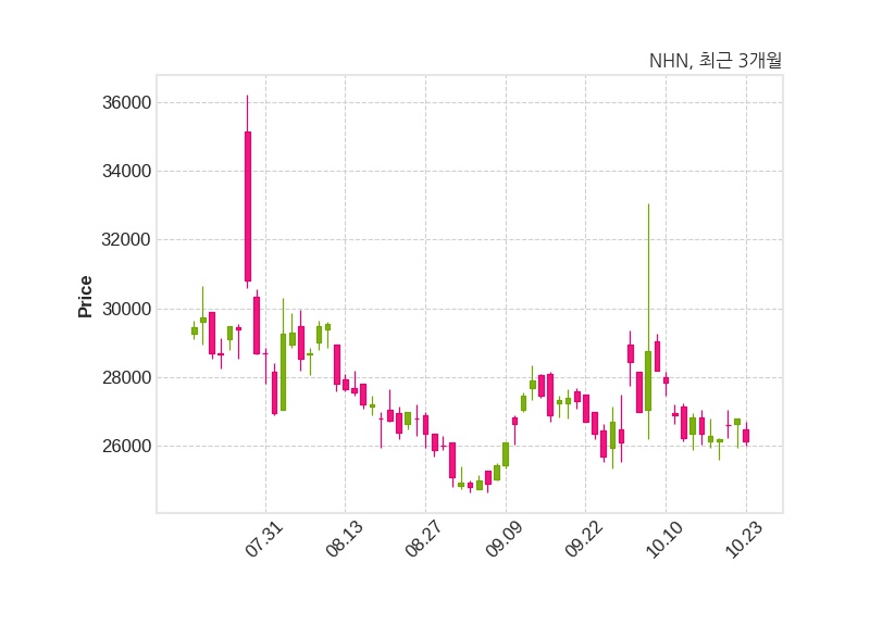 한편, NHN은 장 마감 이후 해당 기업공시를 발표했으며 오늘 종가가 26,150원, 거래량은 62,585주로, 직전 거래일 대비 650원(-2.43%) 하락했다.