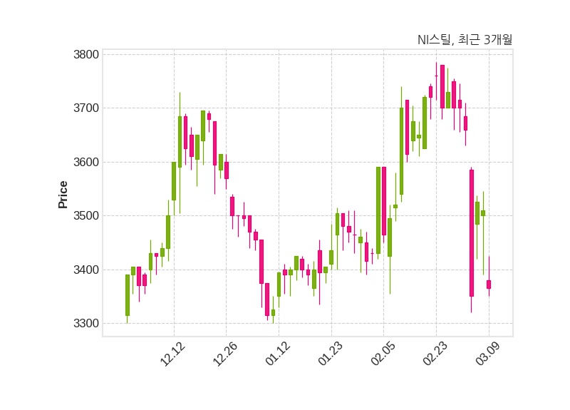 한편, NI스틸의 10시 09분 현재주가는 3,365원으로 직전 거래일 대비 145원(-4.13%) 하락이며, 거래량은 65,141주이다.