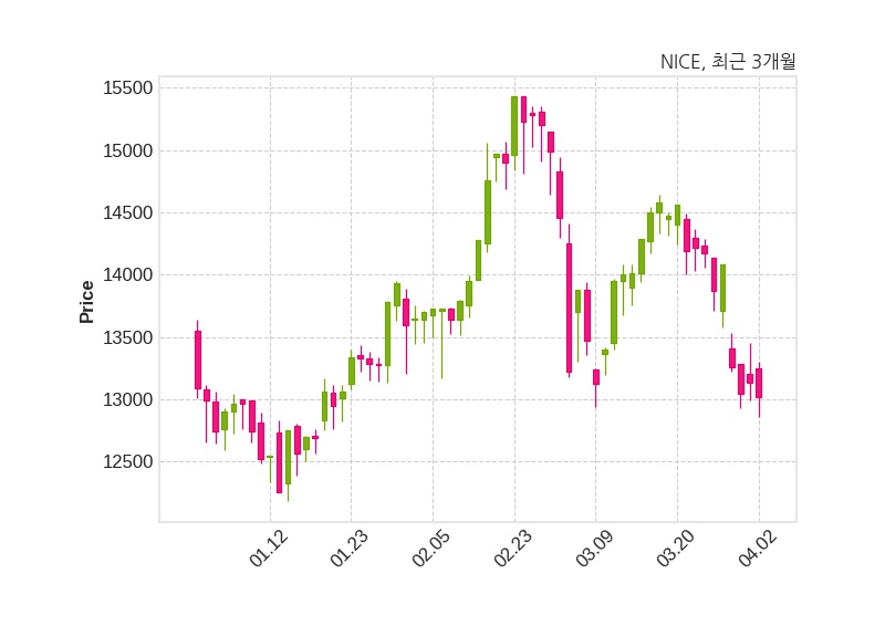한편, NICE은 장 마감 이후 해당 기업공시를 발표했으며 오늘 종가가 13,020원, 거래량은 48,710주로, 직전 거래일 대비 110원(-0.84%) 하락했다.
