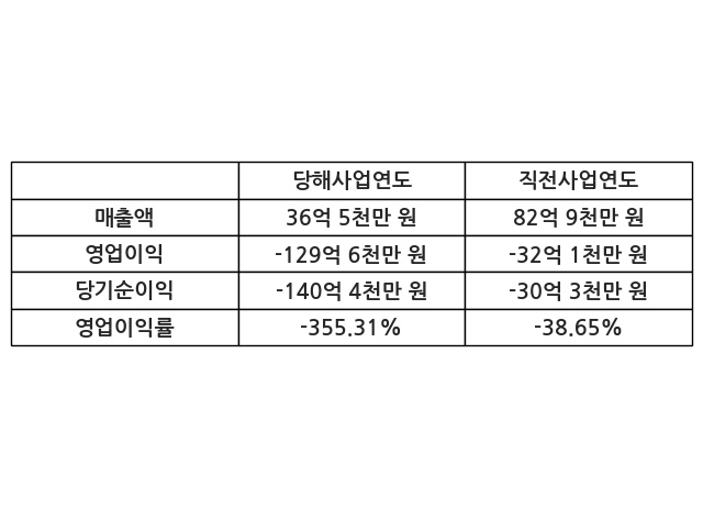 이번사업연도의 매출액은 직전사업연도 대비 -56.02% 감소한 36억 5천만 원, 영업이익은 -129억 6천만 원, 당기순이익은 -140억 4천만 원이라고 공시했다.