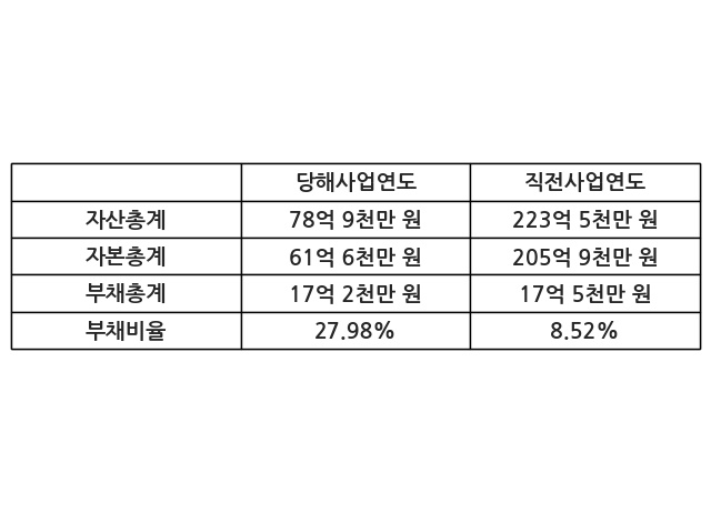 또한, 이번사업연도의 자산총계는 78억 9천만 원으로 직전사업연도 대비 -64.7% 감소한 한편, 부채총계는 17억 2천만 원으로 -1.71% 감소, 자본총계는 61억 6천만 원으로 -70.07% 감소했다.