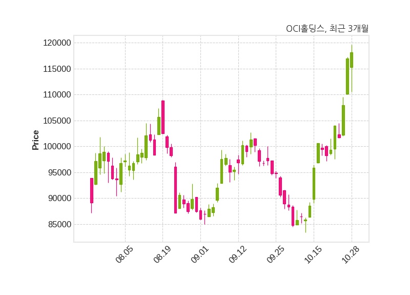 한편, OCI홀딩스는 장 마감 이후 해당 기업공시를 발표했으며 오늘 종가가 118,100원, 거래량은 184,696주로, 직전 거래일 대비 1,100원(+0.94%) 상승했다.