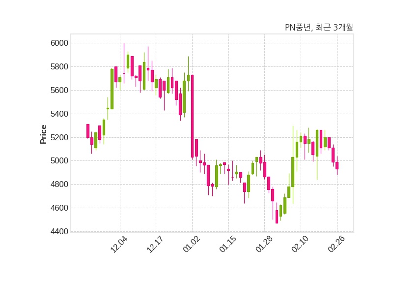 한편, PN풍년의 12시 14분 현재주가는 4,930원으로 직전 거래일 대비 60원(-1.2%) 하락이며, 거래량은 95,814주이다.