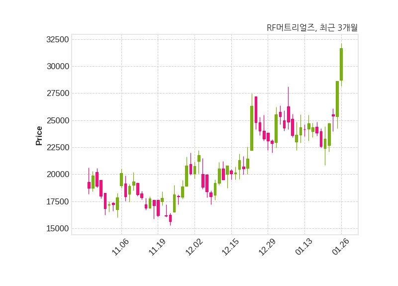 한편, RF머트리얼즈의 14시 55분 현재주가는 31,650원으로 직전 거래일 대비 3,050원(+10.66%) 상승이며, 거래량은 484,038주이다.