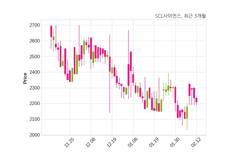 한편, SCL사이언스는 장 마감 이후 해당 기업공시를 발표했으며 오늘 종가가 2,210원, 거래량은 30,884주로, 직전 거래일 대비 25원(-1.12%) 하락했다.