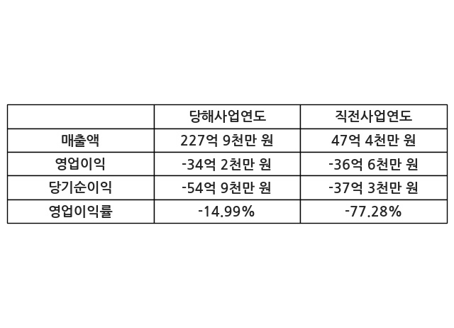 이번사업연도의 매출액은 직전사업연도 대비 381.11% 증가한 227억 9천만 원, 영업이익은 -34억 2천만 원, 당기순이익은 -54억 9천만 원이라고 공시했다.