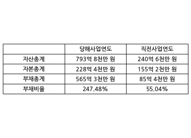 또한, 이번사업연도의 자산총계는 793억 8천만 원으로 직전사업연도 대비 229.94% 증가한 한편, 부채총계는 565억 3천만 원으로 561.97% 증가, 자본총계는 228억 4천만 원으로 47.21% 증가했다.