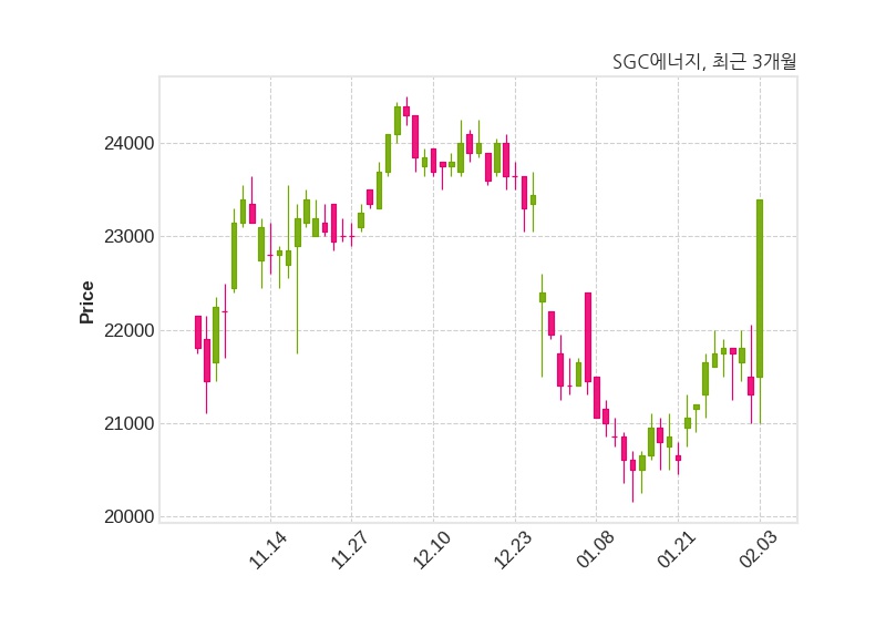 한편, SGC에너지의 15시 27분 현재주가는 23,400원으로 직전 거래일 대비 2,100원(+9.86%) 상승이며, 거래량은 50,223주이다.
