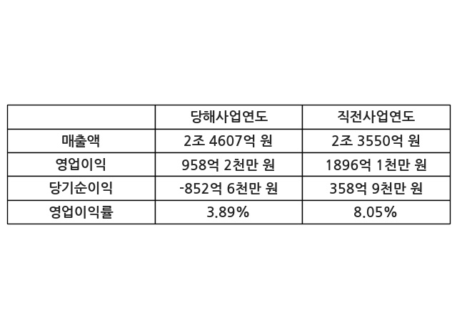이번사업연도의 매출액은 직전사업연도 대비 4.49% 증가한 2조 4607억 원, 영업이익은 958억 2천만 원, 당기순이익은 -852억 6천만 원이라고 공시했다.