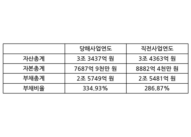 또한, 이번사업연도의 자산총계는 3조 3437억 원으로 직전사업연도 대비 -2.69% 감소한 한편, 부채총계는 2조 5749억 원으로 1.05% 증가, 자본총계는 7687억 9천만 원으로 -13.45% 감소했다.
