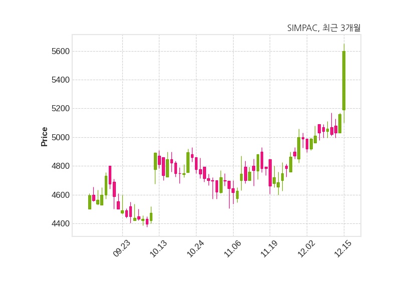 한편, SIMPAC은 장 마감 이후 해당 기업공시를 발표했으며 오늘 종가가 5,600원, 거래량은 636,500주로, 직전 거래일 대비 440원(+8.53%) 상승했다.