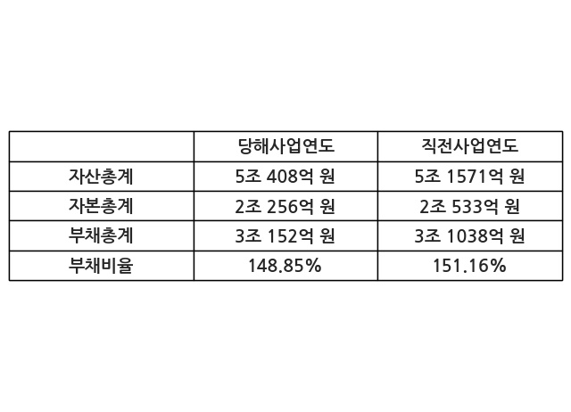 또한, 이번사업연도의 자산총계는 5조 408억 원으로 직전사업연도 대비 -2.26% 감소한 한편, 부채총계는 3조 152억 원으로 -2.86% 감소, 자본총계는 2조 256억 원으로 -1.35% 감소했다.
