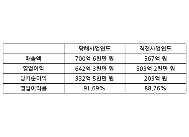 이번사업연도의 매출액은 직전사업연도 대비 23.57% 증가한 700억 6천만 원, 영업이익은 642억 3천만 원, 당기순이익은 332억 5천만 원이라고 공시했다.