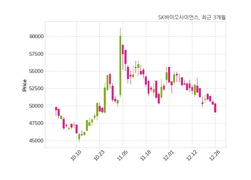 한편, SK바이오사이언스는 장 마감 이후 해당 기업공시를 발표했으며 오늘 종가가 49,100원, 거래량은 140,628주로, 직전 거래일 대비 1,100원(-2.19%) 하락했다.