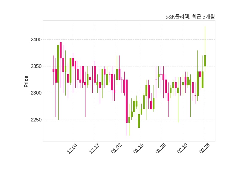 한편, S&K폴리텍은 장 마감 이후 해당 기업공시를 발표했으며 오늘 종가가 2,370원, 거래량은 81,122주로, 직전 거래일 대비 30원(+1.28%) 상승했다.
