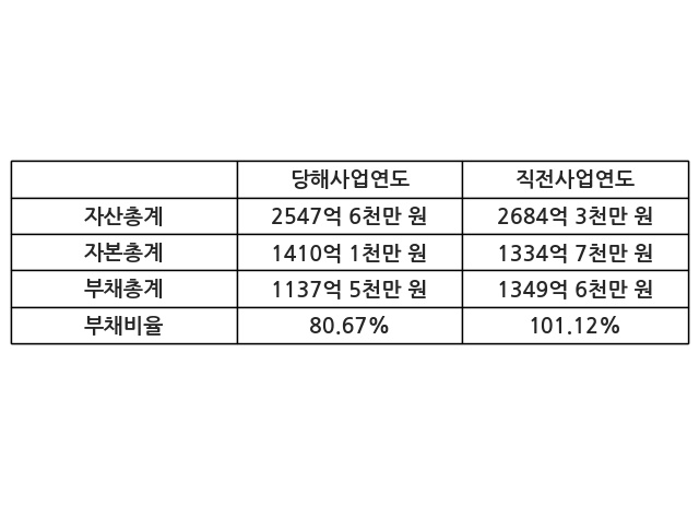 또한, 이번사업연도의 자산총계는 2547억 6천만 원으로 직전사업연도 대비 -5.09% 감소한 한편, 부채총계는 1137억 5천만 원으로 -15.71% 감소, 자본총계는 1410억 1천만 원으로 5.65% 증가했다.