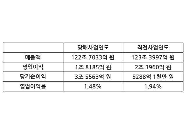 이번사업연도의 매출액은 직전사업연도 대비 -0.56% 감소한 122조 7033억 원, 영업이익은 1조 8185억 원, 당기순이익은 3조 5563억 원이라고 공시했다.