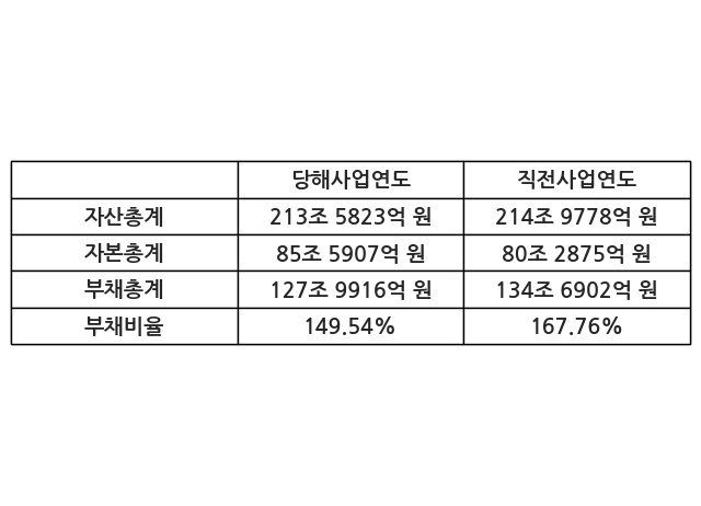 또한, 이번사업연도의 자산총계는 213조 5823억 원으로 직전사업연도 대비 -0.65% 감소한 한편, 부채총계는 127조 9916억 원으로 -4.97% 감소, 자본총계는 85조 5907억 원으로 6.61% 증가했다.