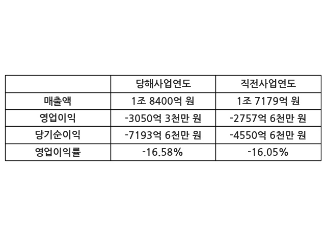 이번사업연도의 매출액은 직전사업연도 대비 7.11% 증가한 1조 8400억 원, 영업이익은 -3050억 3천만 원, 당기순이익은 -7193억 6천만 원이라고 공시했다.