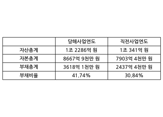 또한, 이번사업연도의 자산총계는 1조 2286억 원으로 직전사업연도 대비 18.81% 증가한 한편, 부채총계는 3618억 1천만 원으로 48.44% 증가, 자본총계는 8667억 9천만 원으로 9.67% 증가했다.