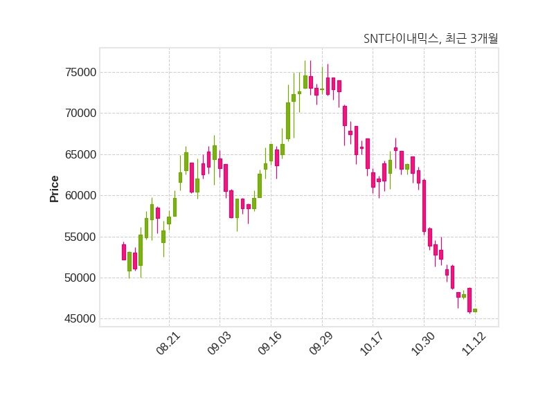 한편, SNT다이내믹스의 09시 01분 현재주가는 46,200원으로 직전 거래일 대비 350원(+0.76%) 상승이며, 거래량은 191주이다.