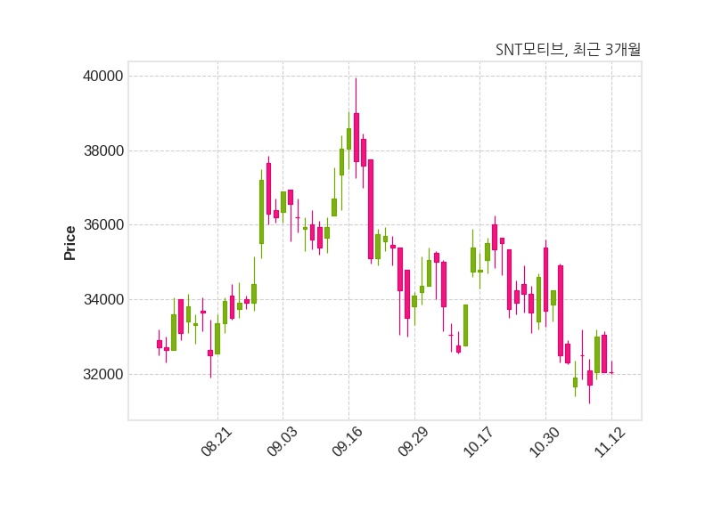 한편, SNT모티브의 09시 03분 현재주가는 32,050원으로 직전 거래일 대비 변동없으며, 거래량은 344주이다.