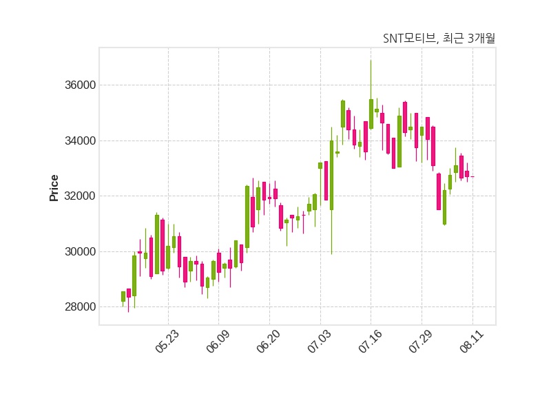 한편, SNT모티브의 09시 00분 현재주가는 32,700원으로 직전 거래일 대비 변동없으며, 거래량은 0주이다.