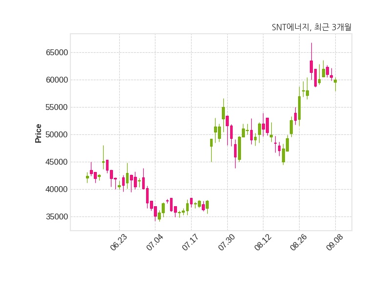 한편, SNT에너지의 14시 24분 현재주가는 60,000원으로 직전 거래일 대비 500원(-0.83%) 하락이며, 거래량은 173,272주이다.