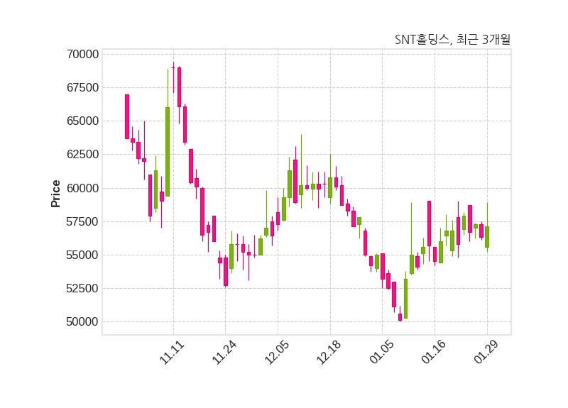 한편, SNT홀딩스의 09시 14분 현재주가는 57,100원으로 직전 거래일 대비 800원(+1.42%) 상승이며, 거래량은 5,547주이다.
