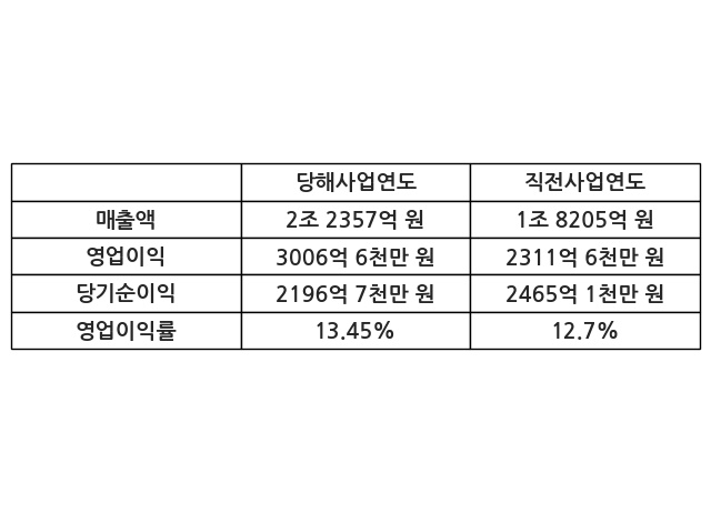 이번사업연도의 매출액은 직전사업연도 대비 22.81% 증가한 2조 2357억 원, 영업이익은 3006억 6천만 원, 당기순이익은 2196억 7천만 원이라고 공시했다.