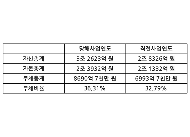 또한, 이번사업연도의 자산총계는 3조 2623억 원으로 직전사업연도 대비 15.17% 증가한 한편, 부채총계는 8690억 7천만 원으로 24.26% 증가, 자본총계는 2조 3932억 원으로 12.19% 증가했다.