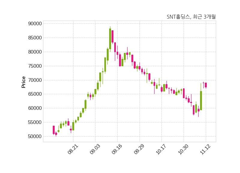 한편, SNT홀딩스의 09시 21분 현재주가는 67,500원으로 직전 거래일 대비 1,500원(-2.17%) 하락이며, 거래량은 4,858주이다.