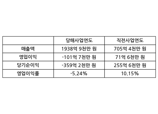 이번사업연도의 매출액은 직전사업연도 대비 174.85% 증가한 1938억 9천만 원, 영업이익은 -101억 7천만 원, 당기순이익은 -359억 2천만 원이라고 공시했다.
