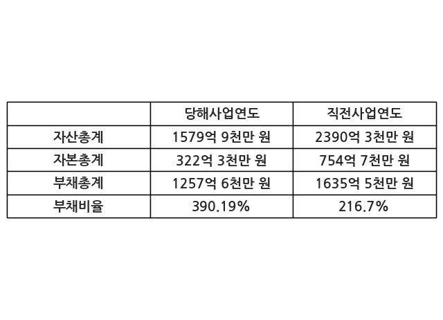 또한, 이번사업연도의 자산총계는 1579억 9천만 원으로 직전사업연도 대비 -33.9% 감소한 한편, 부채총계는 1257억 6천만 원으로 -23.11% 감소, 자본총계는 322억 3천만 원으로 -57.3% 감소했다.