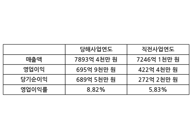 이번사업연도의 매출액은 직전사업연도 대비 8.93% 증가한 7893억 4천만 원, 영업이익은 695억 9천만 원, 당기순이익은 689억 5천만 원이라고 공시했다.