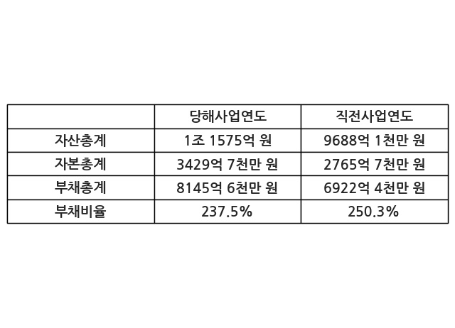 또한, 이번사업연도의 자산총계는 1조 1575억 원으로 직전사업연도 대비 19.48% 증가한 한편, 부채총계는 8145억 6천만 원으로 17.67% 증가, 자본총계는 3429억 7천만 원으로 24.01% 증가했다.