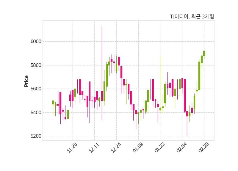 한편, TJ미디어의 14시 09분 현재주가는 5,920원으로 직전 거래일 대비 40원(+0.68%) 상승이며, 거래량은 10,656주이다.