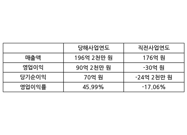 이번사업연도의 매출액은 직전사업연도 대비 11.48% 증가한 196억 2천만 원, 영업이익은 90억 2천만 원, 당기순이익은 70억 원이라고 공시했다.