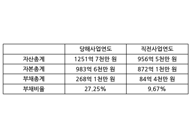 또한, 이번사업연도의 자산총계는 1251억 7천만 원으로 직전사업연도 대비 30.87% 증가한 한편, 부채총계는 268억 1천만 원으로 217.81% 증가, 자본총계는 983억 6천만 원으로 12.79% 증가했다.